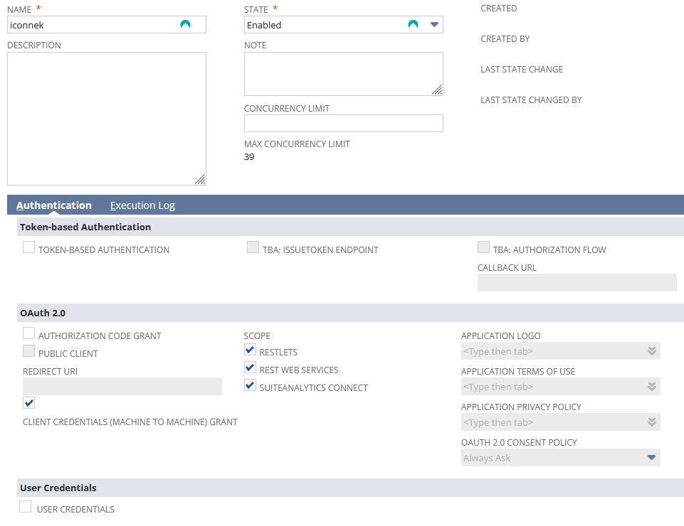 Log in using OAuth 2.0 Access Tokenspermission. - Application: Select your integration (e.g., iconnek).